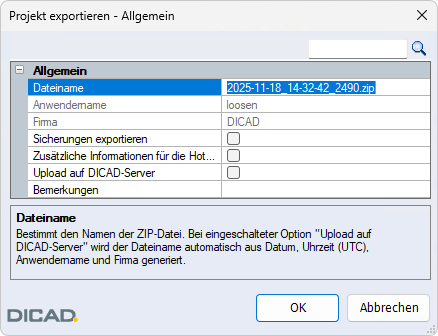 Bei nicht eingeschalteter Option Upload auf DICAD-Server wird als Speicherort für die exportierte ZIP-Datei standardmäßig der Projektordner und als Dateiname der Name des Projektes vorgeschlagen.