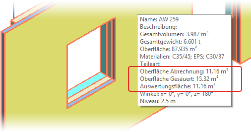 Nach Bestätigen der Eingaben werden auch über den Tooltip die Werte der Oberflächen angezeigt: