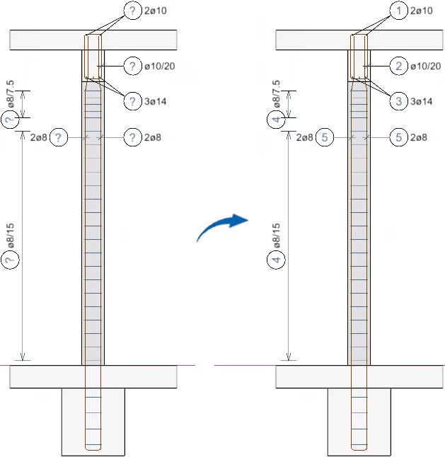Mit den Funktionen der Bewehrungsbeschriftung können Sie die Bewehrung von 3D-Objekten, Flex-Bauteilen und 3D-Einbauteilen in den Cube-Sichten von Übersichts- und Werkplänen beschriften.