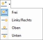 Lage Pos.-Symbol Umschalticon ![]() Lage des Positionssymbols (Umrandung der Positionsnummer, Positionsnummer und Bewehrungstext) bezogen auf die Markierungslinie wählen Oben Positionssymbol mittig über der Markierungslinie ablegen ![]() Unten Positionssymbol mittig unter der Markierungslinie ablegen ![]() Links/Rechts Positionssymbol links oder rechts von der Markierungslinie ablegen ![]() Frei Die Lage des Positionssymbols frei bestimmen | |