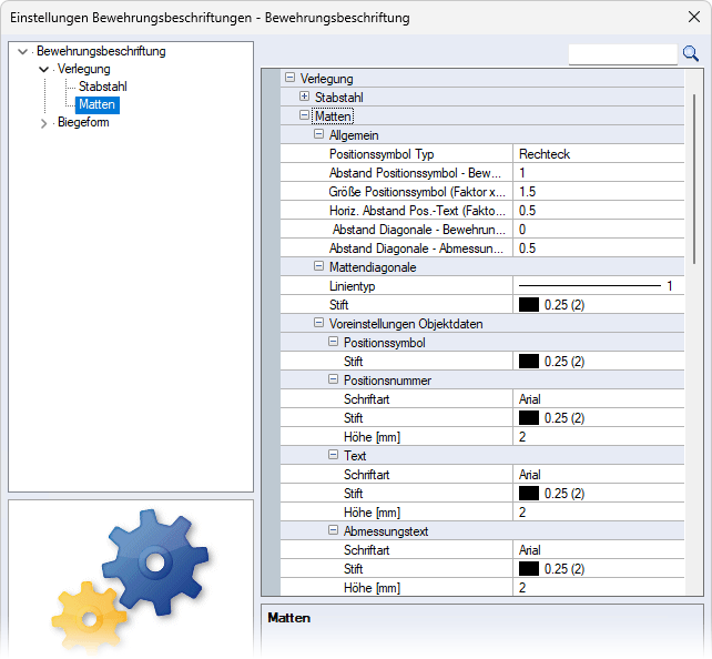 Vor der Eingabe der Bewehrungsbeschriftung für die Matten Biegeform können Sie Voreinstellungen bestimmen.