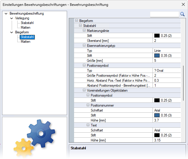 Vor der Eingabe der Bewehrungsbeschriftung können Sie für das Positionsymbol den Stift und für die Positionsnummer und den Text die Schriftart, den Stift und die Höhe bestimmen.