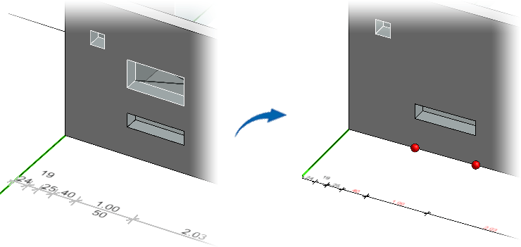 Maßpunkte ohne Anbindung manuell korrigieren Fangen Sie zuerst mehrere der rot markierten Objektpunkte (mit gedrückter Taste [STRG] oder das Aufziehen eines Ausschnitts) oder selektieren Sie einen einzelnen Objektpunkt durch Anklicken. Dann bestimmen Sie den neuen Anbindepunkt. ![]() | |