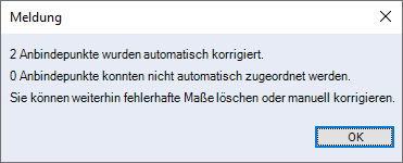 Maßpunkte ohne Anbindung automatisch korrigieren Schalten Sie diese Funktion ein, werden die Maßpunkte automatisch korrigiert, d.h. die Anbindepunkte werden neu zugeordnet, wenn in Blickrichtung weitere Anbindepunkte liegen. Beispiel: Eine Wandöffnung mit den Anbindepunkten der Maße wurde gelöscht. Wird die Automatik eingeschaltet, prüft das Programm, ob in Blickrichtung weitere Punkte liegen, an denen das Maß angebunden werden kann. Werden Objektpunkte gefunden, werden diese automatisch als neue Anbindepunkte zugeordnet. ![]() Beachten Sie, für eine automatische Anbindung muss die Eingabeansicht fixiert sein (siehe Einstellung Ansicht fixieren). ![]() Nach der Zuordnung wird eine Meldung angezeigt: ![]() Bestätigen Sie diese Information, wird die Maßkette ohne fehlerhafte Maße dargestellt. |