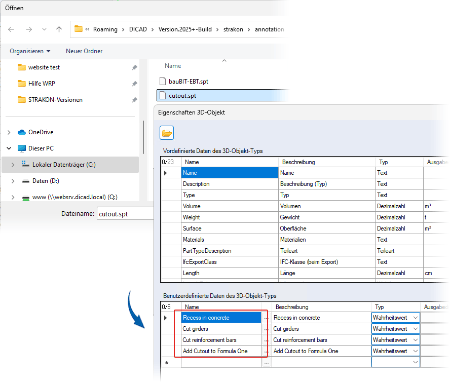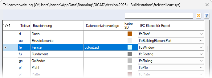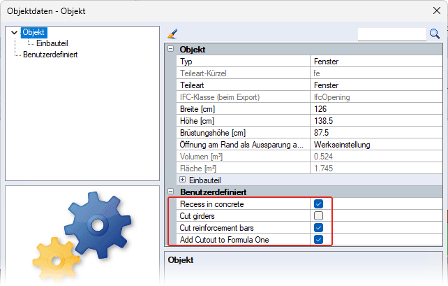 Teilearten können Sie den Datencontainer aller Abzugsobjekte und Wandöffnungen um diese benutzerdefinierten Daten erweitern.