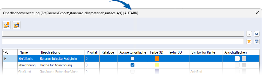 In der Oberflächenverwaltung bestimmen Sie Eigenschaften der Oberflächen, wie z.B. die Farbe zur Darstellung im 3D (siehe im