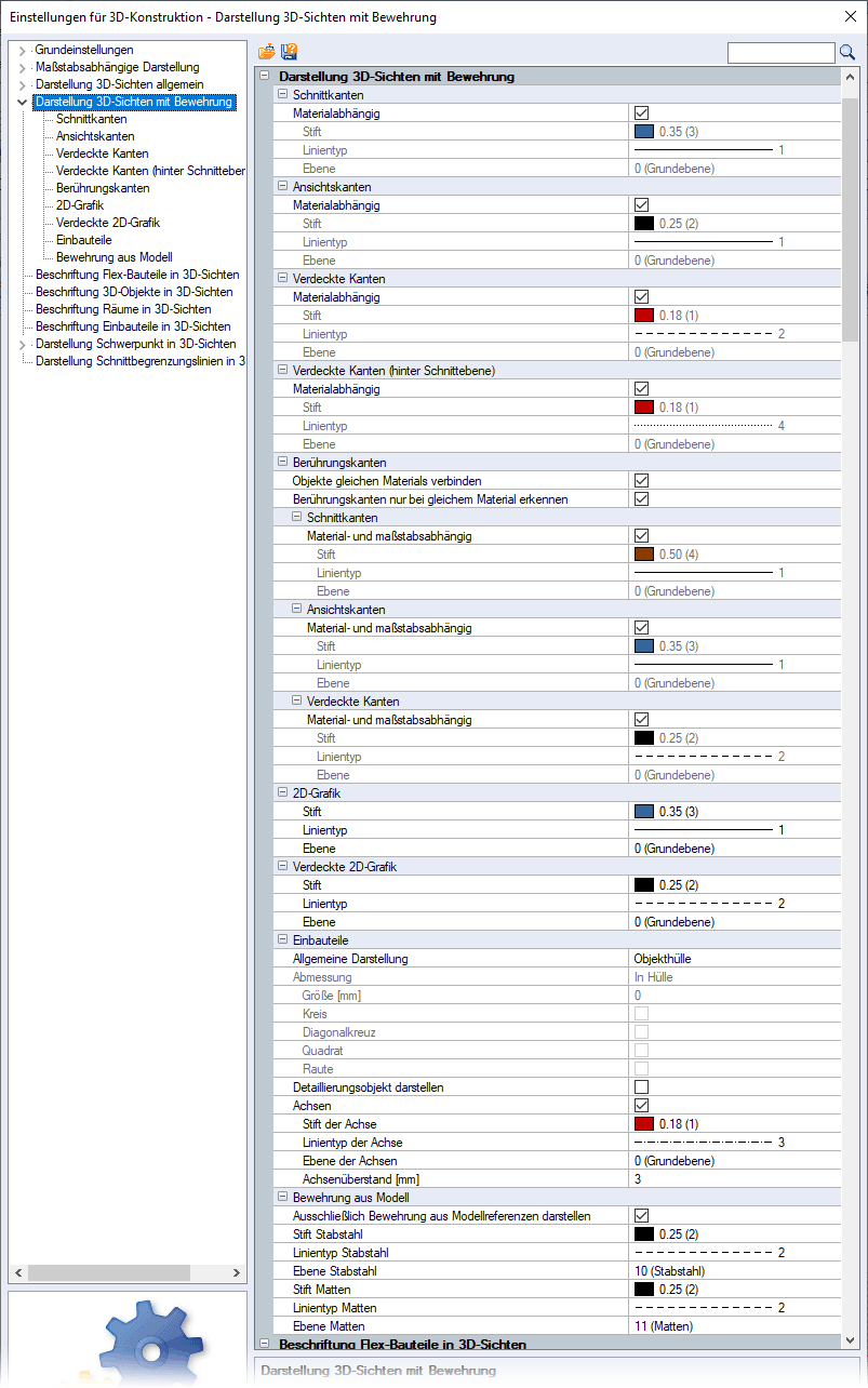 Für die Darstellung der 3D-Sichten im Bewehrungsplan die materialabhängigen Einstellungen der Stifte aus der Materialverwaltung verwenden