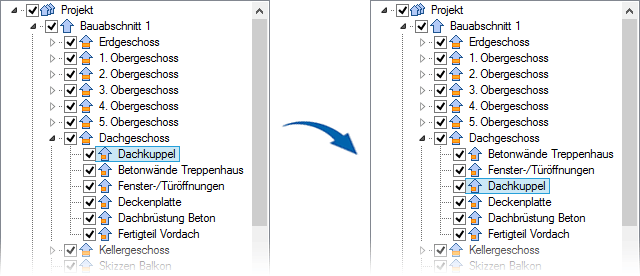 Objekte anzeigen Objekte ausblenden Umschalticon Zu jeder Ebene zugehörige Bauteile und Objekte anzeigen, ein-/ausschalten Hierdurch erweitert sich die Projektstruktur durch weitere Ebenen je Bauteil bzw. Objekt, über die Sie diese im Modell ein-/ausschalten können. Durch erneutes Klicken auf das Icon werden diese Ebenen ausgeblendet. |