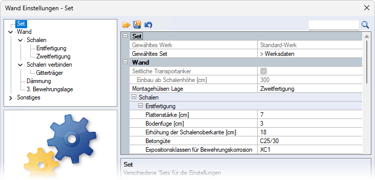 > Werksdaten | > Werksdaten Set eingeben oder über die Auswahlliste wählen: Hier werden nur die Sets für den Wandtyp zur Auswahl angeboten, den Sie gerade erzeugen, da für die verschiedenen Wandtypen unterschiedliche Daten in den Sets hinterlegt sind. |