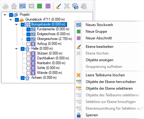 Abhängig von der Ebene, in der Sie sich befinden, wird für eine weitere Gliederung in der Iconleiste über aktive Icons sowie über das Kontextmenü die entsprechende Projektebene angeboten.