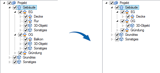 Hierdurch erweitert sich die Projektstruktur durch weitere Ebenen je Bauteil bzw. Objekt, über die Sie diese im Modell ein-/ausschalten können. Durch erneutes Klicken auf das Icon werden diese Ebenen ausgeblendet.