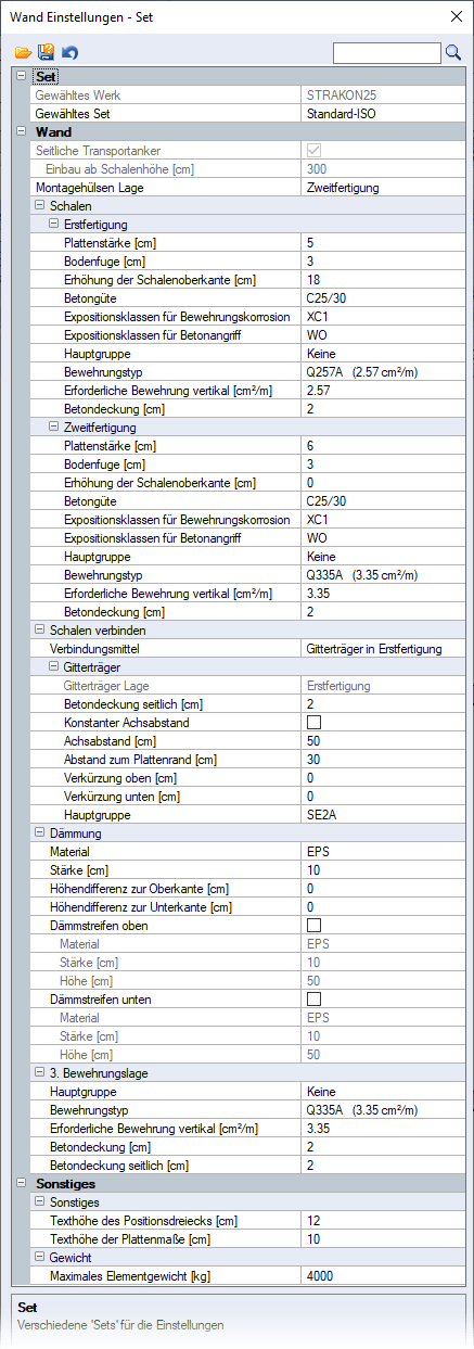 Speichern unter... Wand-Einstellungen in einem Set speichern Bei Auswahl dieses Sets erhalten Sie dann für die Erzeugung einer Wand sofort die gewünschten Einstellungen. ![]() Die Sets *.wset werden in den Ordner der Werksdaten für FT-Plan ..\ft-plan\werksdaten\strakon\settings\walls gespeichert. |