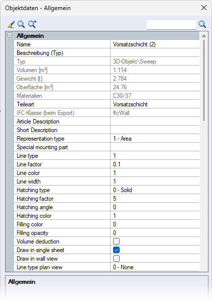 Beim Anklicken eines Flächenenbauteils in der Verwaltung (siehe Menü