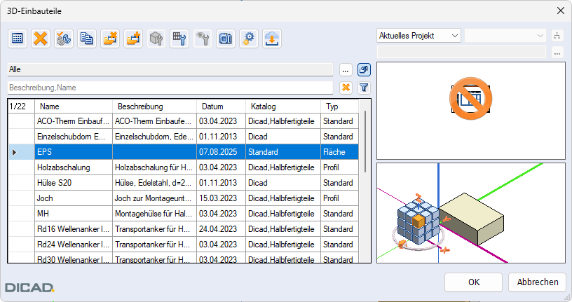 3D-Vorschau wird das Flächeneinbauteil als Quader mit der eingestellten Dicke dargestellt.