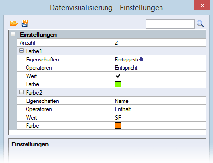 Über die Anzahl bestimmen Sie, wie viele Bedingungen zutreffen sollen. Die Daten legen Sie fest analog der datenabhängigen Selektion oder öffnen eine SDV-Datei mit schon hinterlegten Daten (die Datei kann in einem beliebigen Ordner liegen). Die Farbe zur Visualisierung im Modell wählen Sie über die Farbpalette. Sind mehrere Bedingungen vorhanden, werden die Bedingungen von oben nach unten abgearbeitet.