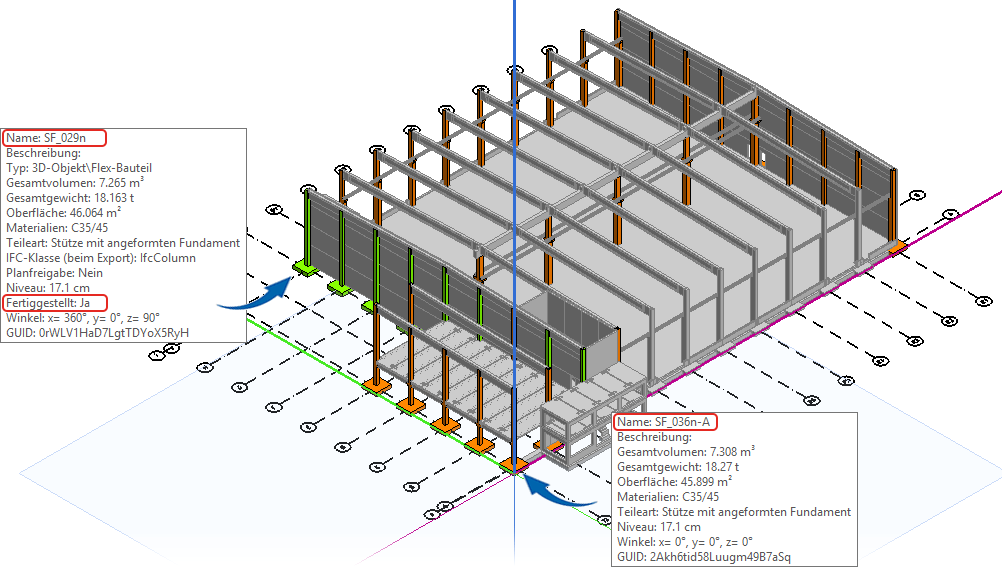 Im Beispiel werden alle Bauteile, die die Eigenschaft Fertiggestellt haben, grün markiert. Zusätzlich werden alle Bauteile, die SF im Namen enthalten und nicht zu den fertiggestellten Bauteilen gehören, orange dargestellt.