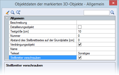 Ein nochmaliger Aufruf der Objektdaten der Stellbretter ermöglicht eine Korrektur der Maßwerte bzgl. der Schraublöcher: