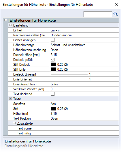 Einstellungen für Höhenkote ![]() In dem Einstellungsdialog können Sie die Darstellung der Höhenkote bestimmen sowie weitere Einstellungen wie z.B. die Einheit wählen und einen Zusatztext eingeben. Die hier gewählten Einstellungen werden in der Datei userprefs.toml im Verzeichnis der Benutzerdaten ..\strakon\settings gespeichert (siehe Einstellungsdatei für den Cube). | |