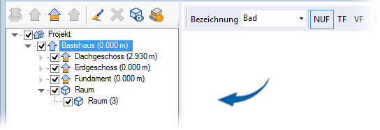 Objekte anzeigen / Objekte ausblenden Umschalticon Zu jeder Ebene zugehörige Bauteile und Objekte anzeigen, ein-/ausschalten Hierdurch erweitert sich die Projektstruktur durch weitere Ebenen je Bauteil bzw. Objekt, über die Sie diese im Modell ein-/ausschalten können. Durch erneutes Klicken auf das Icon werden diese Ebenen ausgeblendet. |